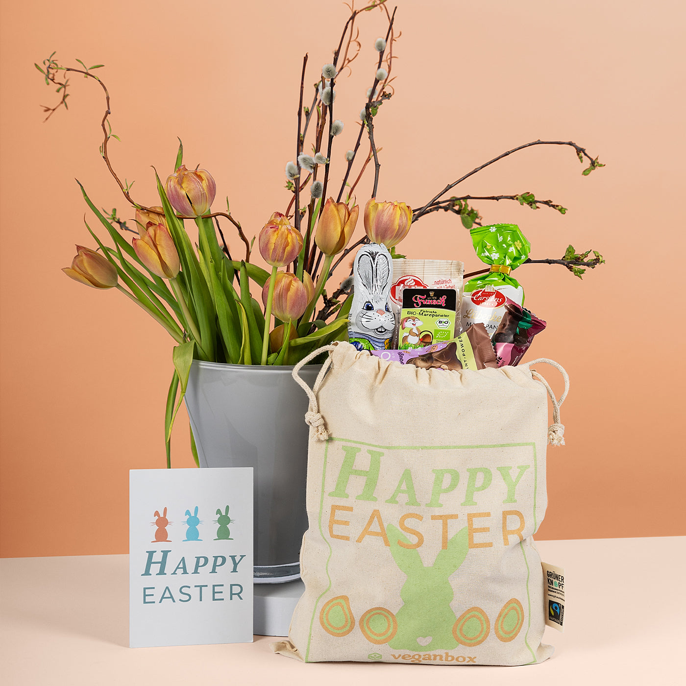 Unser Osterbeutel mit ausgewählten veganen Naschereien ist perfekt für's vegane Osternest und ein wunderbares Mitbringsel für die Feiertage. Freue dich unter anderem auf einen veganen Osterhasen und weitere süße Überraschungen.