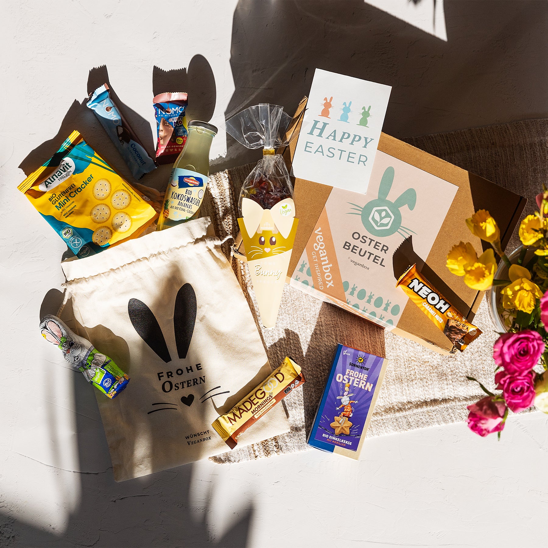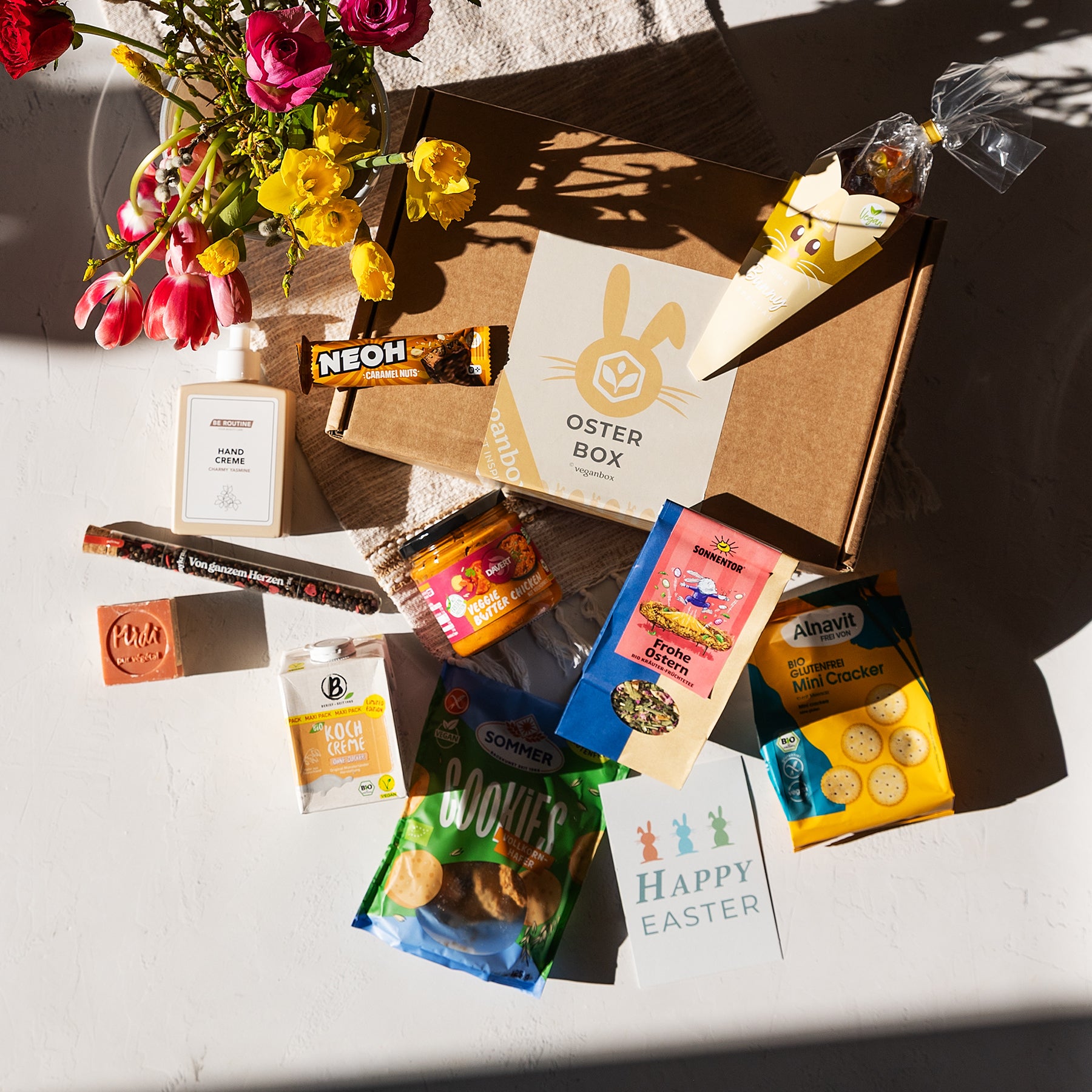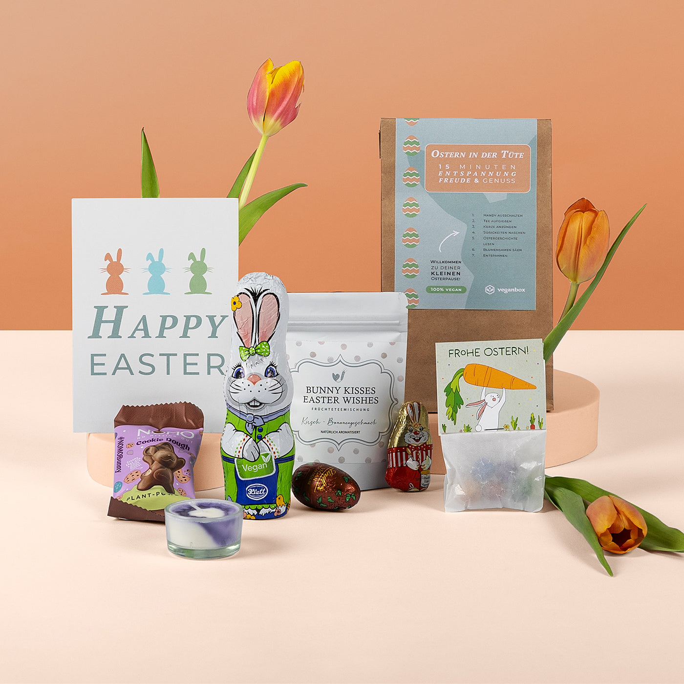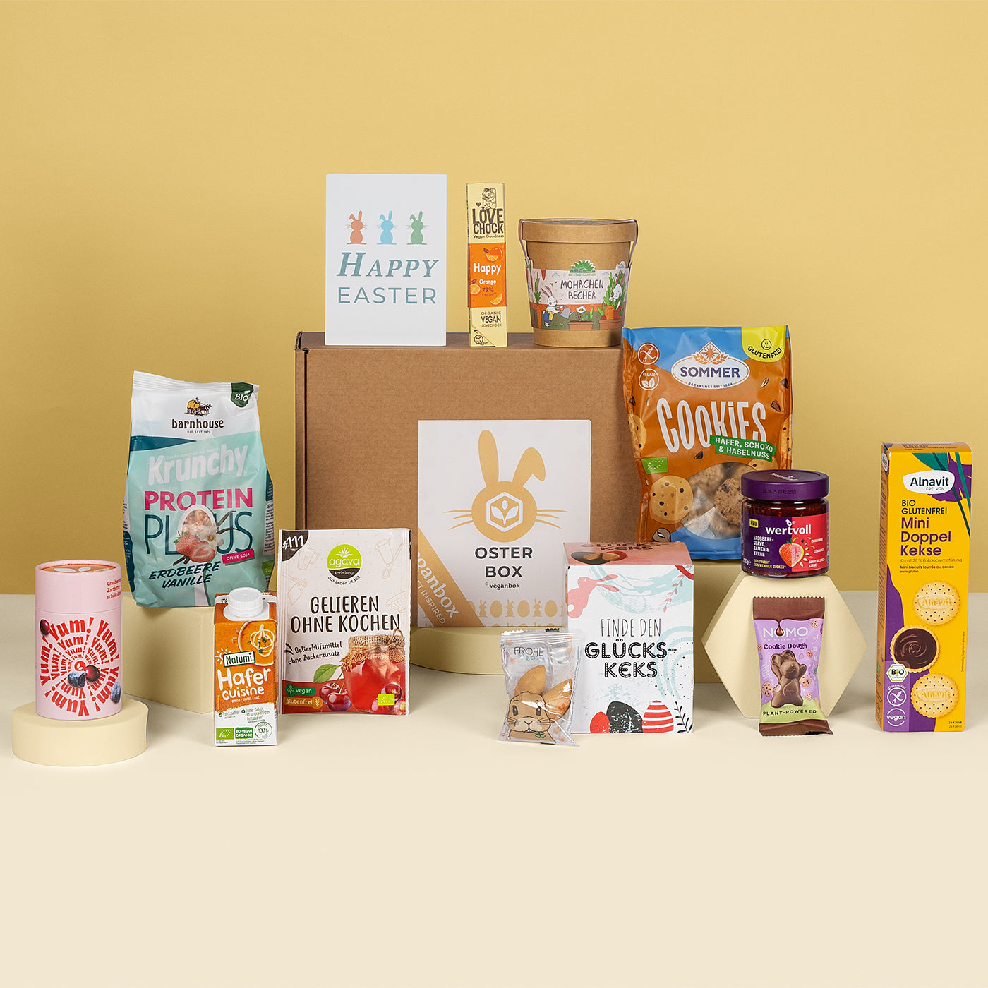 Unsere liebevoll zusammengestellte Box enthält eine Vielzahl von veganen Ostersüßigkeiten, darunter verlockende vegane Osterschokolade, Kekse und mehr. Doch das ist nicht alles – auch leckere Produkte zum Frühstück und weitere Überraschungen warten darauf, von dir entdeckt zu werden.
