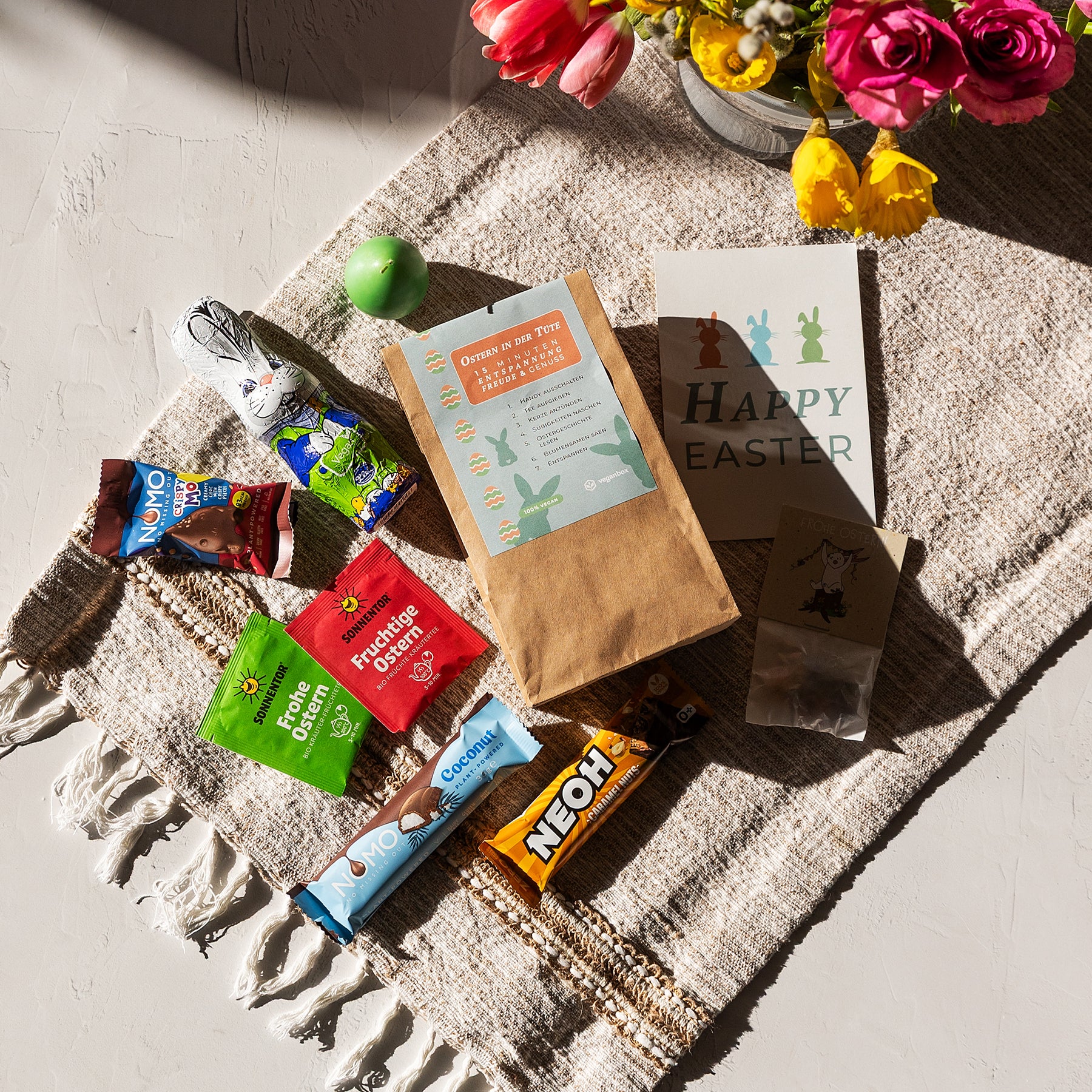 Die Ostertüte schenkt dir eine kleine, bewusste Auszeit vom Alltag. Schalte das Handy aus, gieße dir eine Tasse Tee auf, zünde das Teelicht an, genieße die veganen Ostersüßigkeiten und lass dich von der Ostergeschichte inspirieren. Mit den Blumensamen kannst du den Frühling einläuten und dich auf das Blühen freuen.