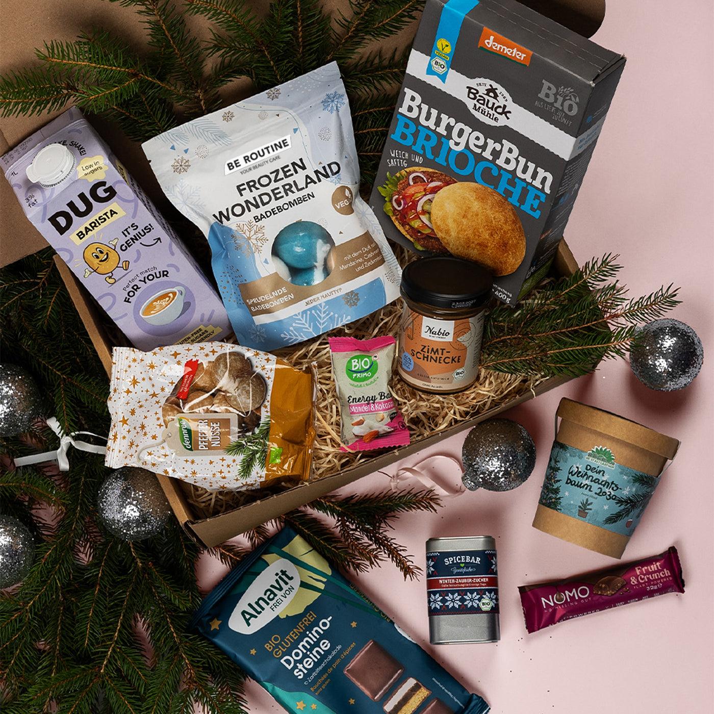 Ob Weihnachtsbeutel, Geschenkbox Weihnachten, XMAS Dinner Box oder Weihnachtstüte – jedes Set ist mit hochwertigen, veganen Produkten gefüllt und perfekt, um Freude zu verschenken oder dir selbst eine kleine Auszeit zu gönnen.