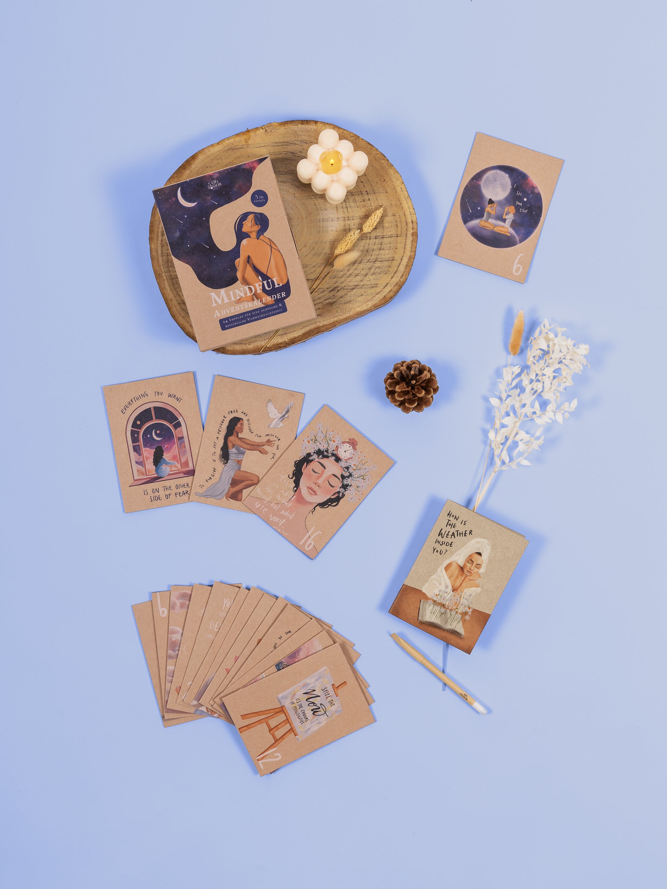 Der Mindful Adventskalender enthält 24 aufklappbare Achtsamkeitskarten mit thematischen Illustrationen, ein Journal aus Graspapier zum Festhalten deiner Gedanken und einen Samenstift.