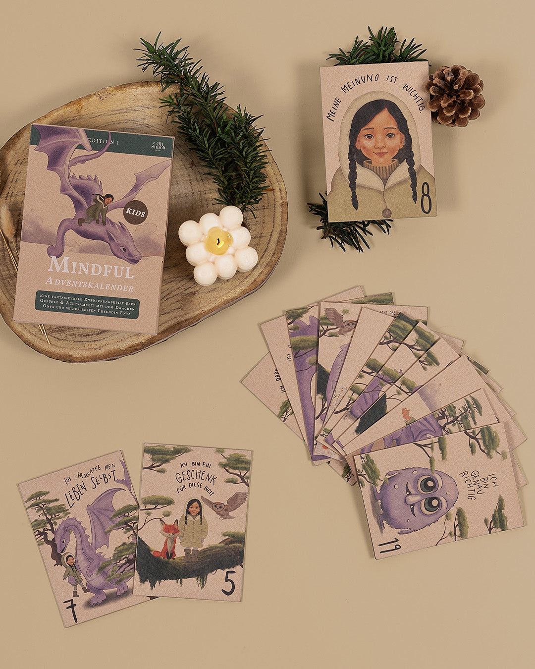 Der Mindful Adventskalender KIDS Edition ist ein speziell für Kinder im Alter von 4 bis 7 Jahren entwickelter Adventskalender. Er enthält 24 zauberhafte Achtsamkeitskarten und Affirmationen, die auf liebevolle Weise Geschichten erzählen und Kinder dabei unterstützen, ihre Emotionen besser zu verstehen und Achtsamkeit zu üben.